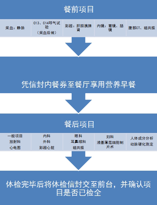 體檢流程 文章來源:健康管理中心 作者: 點擊數(shù):17989 更新時間:2019-11-14 餐后項目亦可在餐前進(jìn)行 上一篇: 衢州市人民醫(yī)院健康管理中心簡介 下一篇: 2019年體檢套餐 (女)