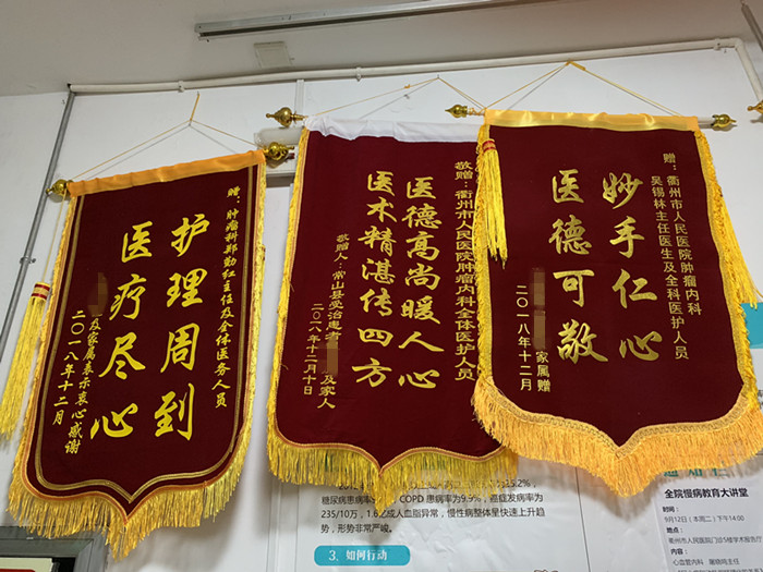 12月12日,常山的程大爺和他的妻子如期來到腫瘤內(nèi)科病房,因為他的化療時間到了。這次他專門帶來了一面錦旗,上面寫著“醫(yī)德高尚暖人心,醫(yī)術(shù)精湛傳四方”。程大爺說這是他專門請當(dāng)?shù)氐念}詞人寫的,的確,程大爺就是這樣一個事事認(rèn)真、樸實和善的老人。