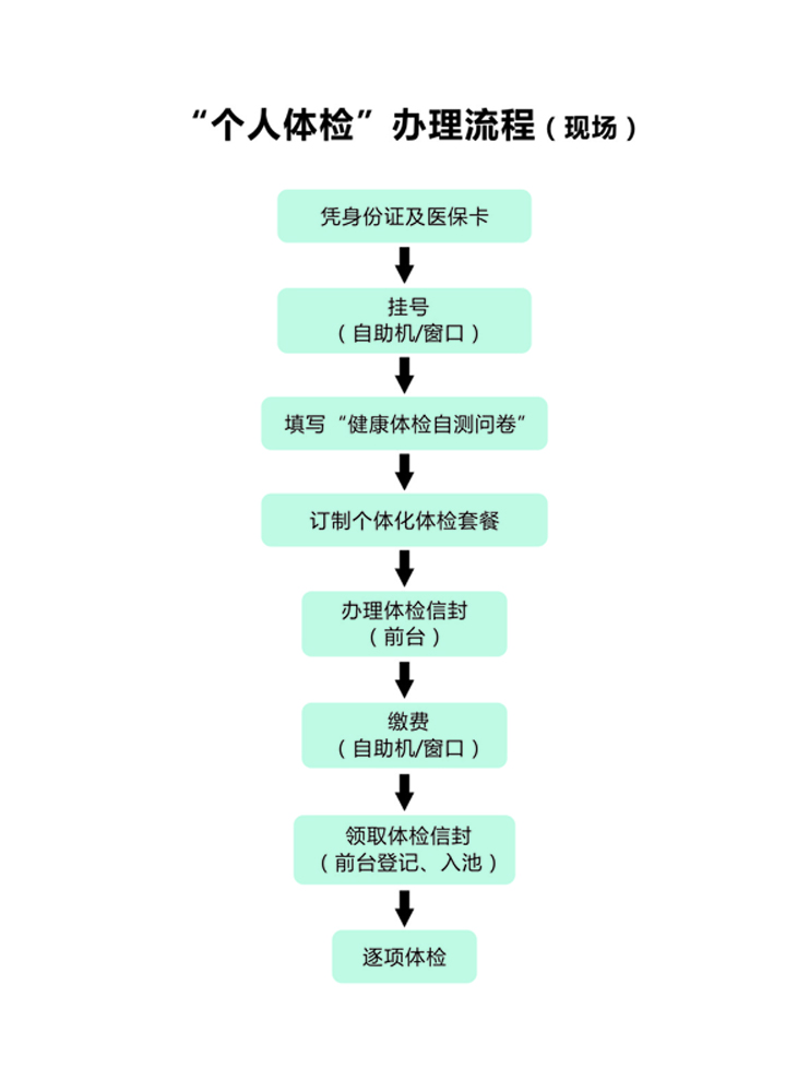體檢辦理流程 文章來源:健康管理中心 作者: 點擊數(shù):13712 更新時間:2019-11-15 上一篇: 體檢,到這里!11月8日,四省邊際中心醫(yī)院健康管理中心啟用 下一篇: 2019年體檢套餐 (女)