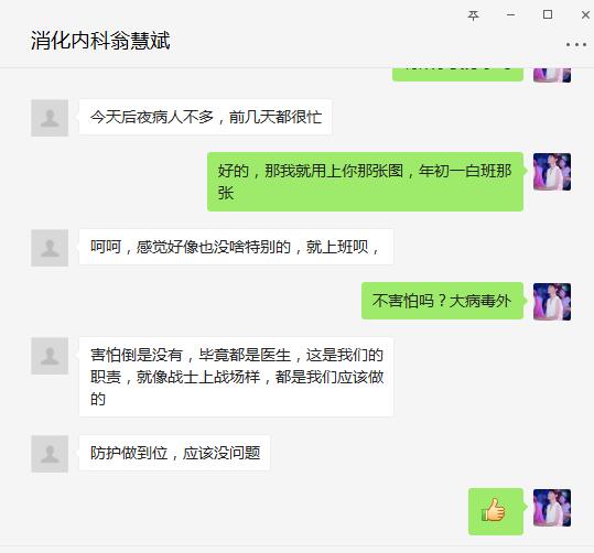 翁慧斌,消化內(nèi)科副主任醫(yī)師,1月19日選派到發(fā)熱門診坐診,這是他在年初一時留下的一張自拍,小編采訪問:怕嗎?他說,“害怕倒是沒有,畢竟是醫(yī)生,這是我們的職責(zé),就像戰(zhàn)士要上戰(zhàn)場樣,都是我們應(yīng)該做的?!?