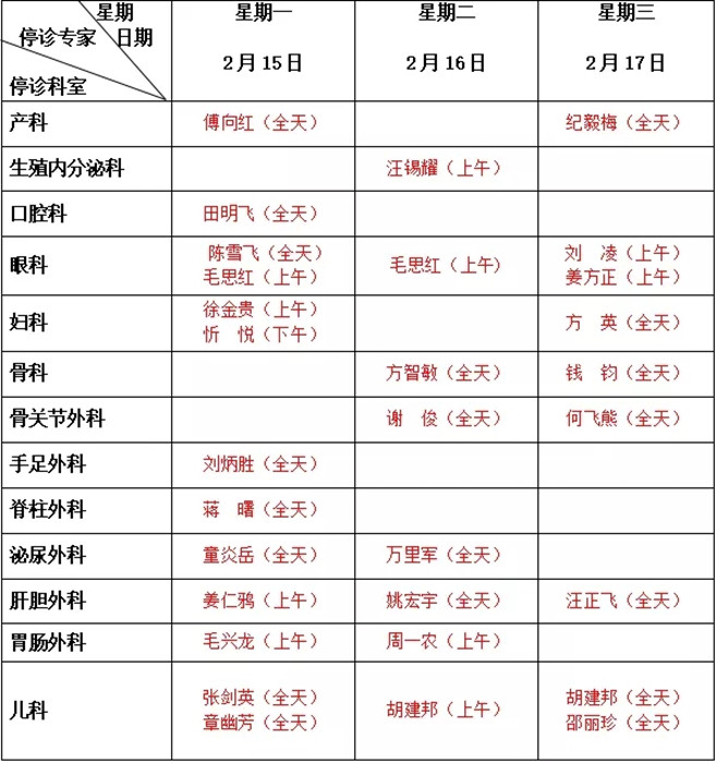 2.2月16日停診科室:眼視光夜門診、產(chǎn)科高危門診、房顫門診、心血管內科普通門診、 神經(jīng)內科普通門診、手與顯微外科專科門診。