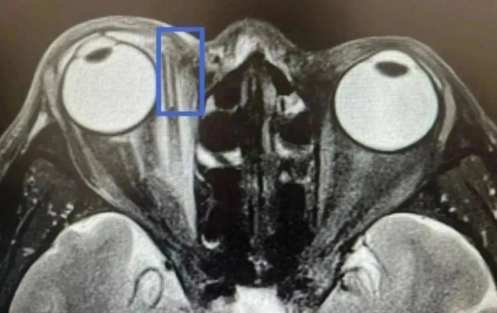 詳細詢問受傷過程時,王老伯始終否認有異物進入眼里。但眼眶磁共振檢查顯示,王老伯右眼深處內支肌旁有一長條異物。